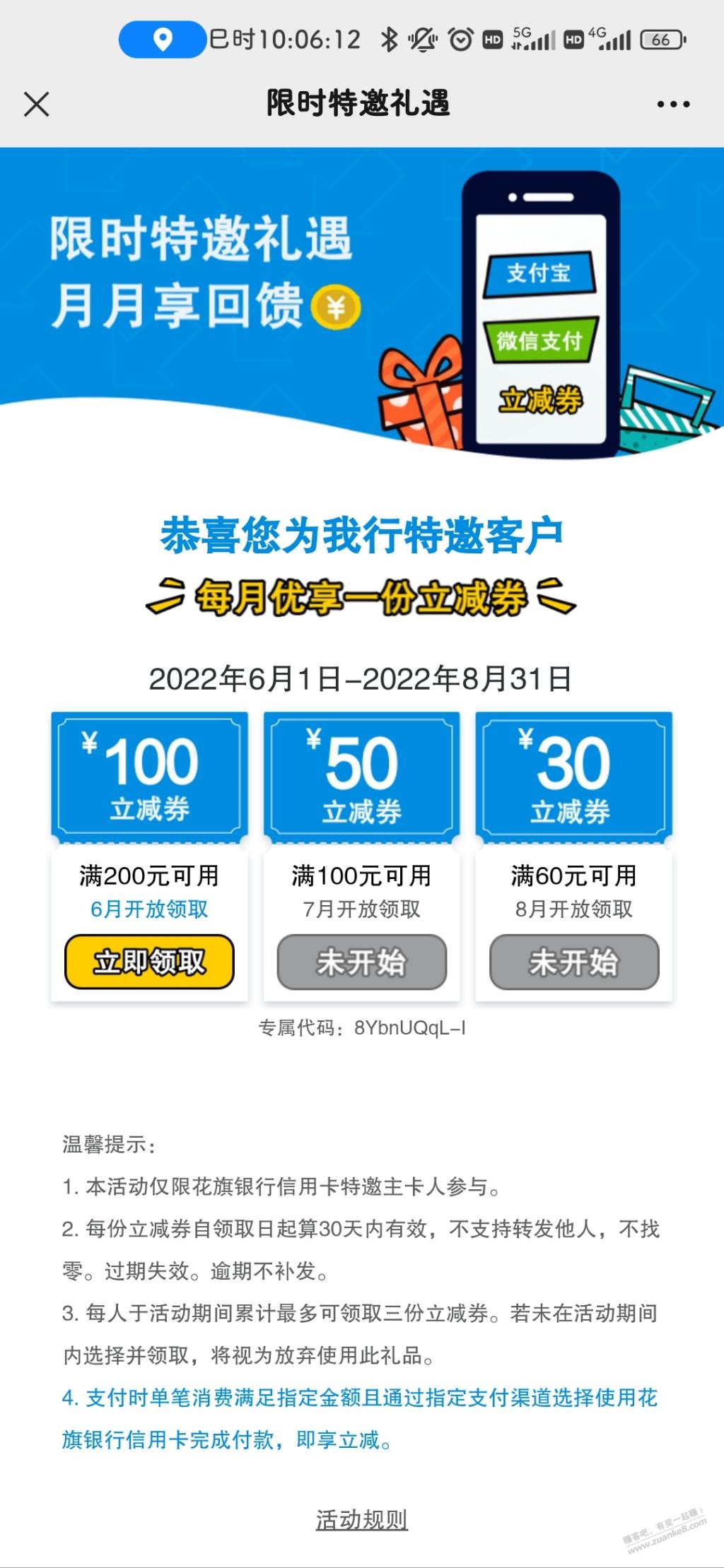 花旗活动 2022年 6月 27日 10:08 作者 kkkkn 【花旗银行】感谢接听!请于本月底前通过花旗xing/用卡VX公众号【我的优惠】-【我要参加活动】参与领取价值180元支付宝红包或VX立减金。专属代码:M0060626891,转发无效。回复TDCU00退订。