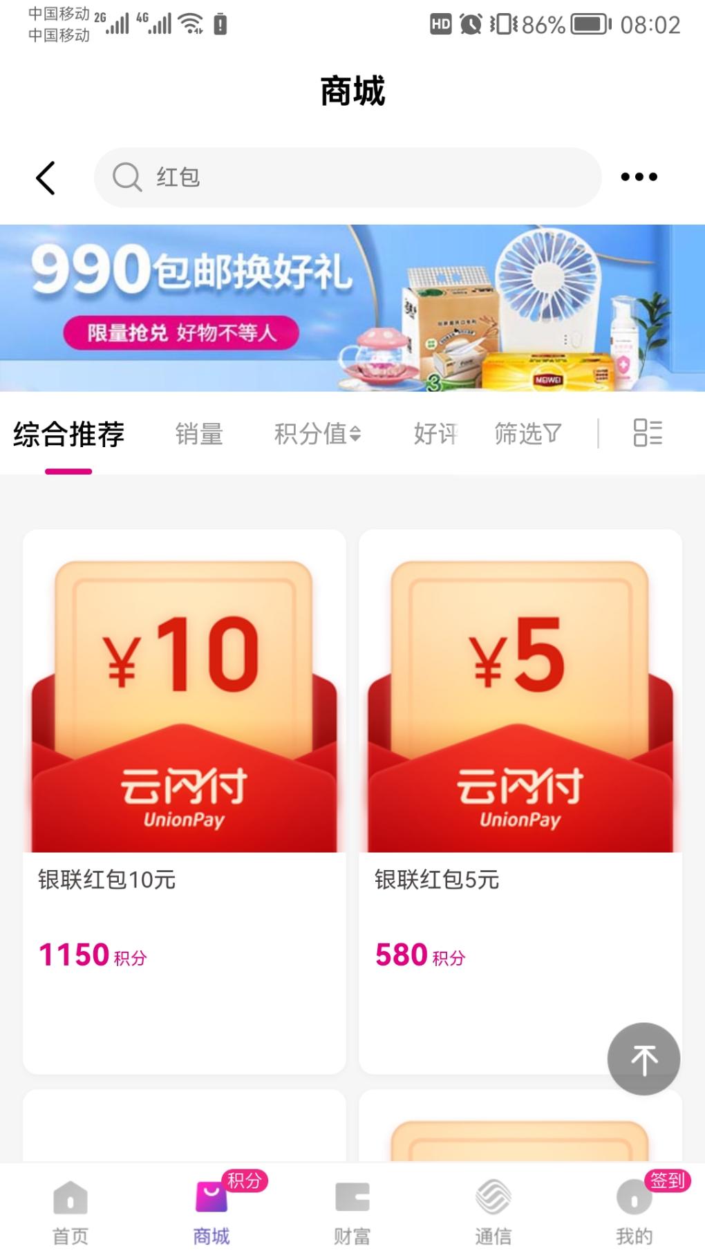 兑换10元云闪付红包 2022年 7月 5日 08:03 作者 kkkkn 1、和包APP-我的-我的会员-1积分开会员季卡,每月可领:1000商城积分、5元话费/缴费券(邀请好友开通可额外领1份)(每日6点更新库存) 2、和包APP-我的-签到领积分(右上角),完成任务可领取:大约150积分 3、和包APP-商城-搜索“红包”,1150积分可兑换:10元云闪付红包。