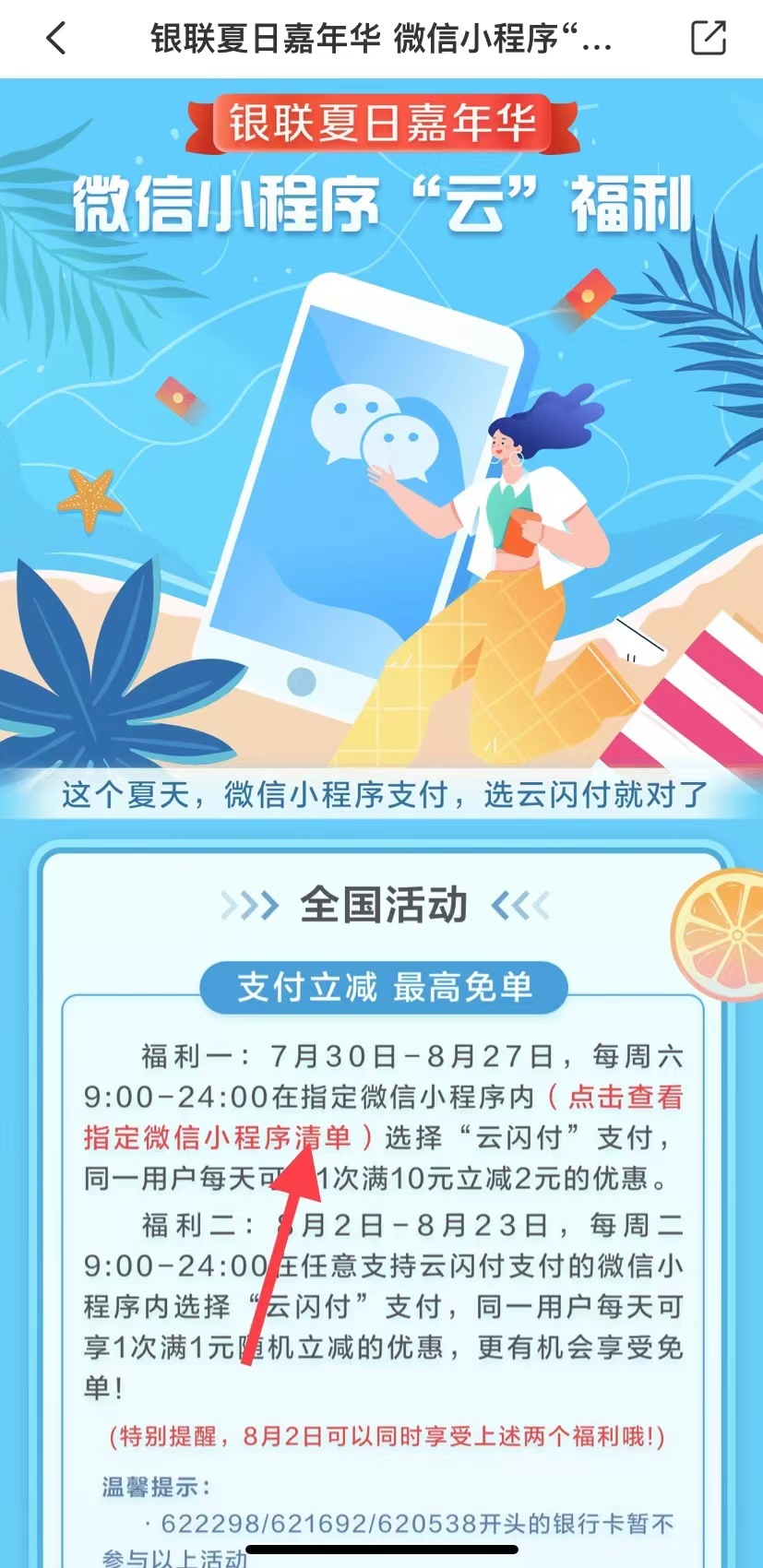云闪付V.x小程序满10-2,可交电费 2022年 8月 9日 20:41 作者 kkkkn 7月30日-8月27日通过云闪付指定的VX小程序,每周六满10元立减2元(最高免单),可以小程序点单10-2,手机充值,缴电费等 8月2日-23日每周二享受满1元随机立减 云闪付搜索【VX小程序福利】-去查看指定VX小程序清单和具体规则