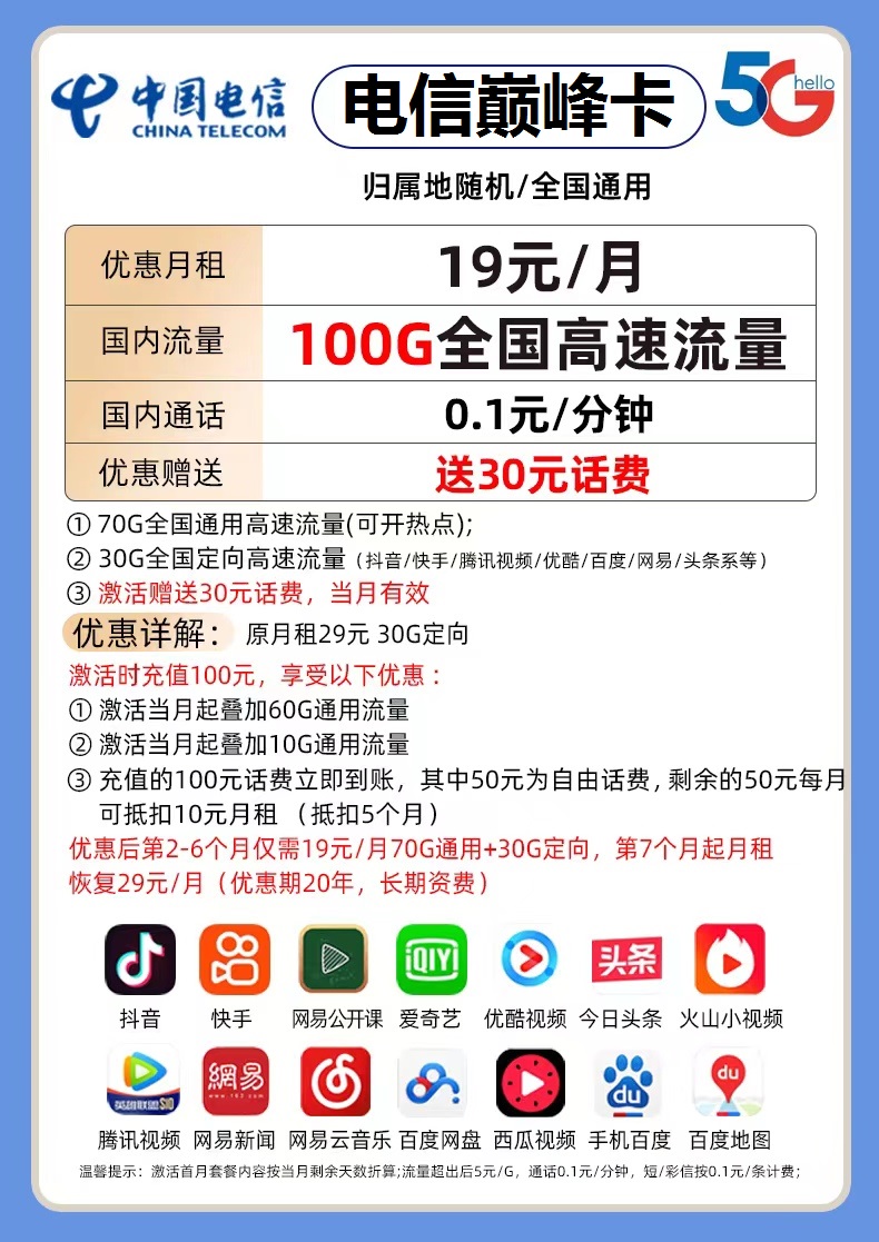 电信巅峰卡19元包70G通用流量+30G定向流量+通话0.1元/分钟