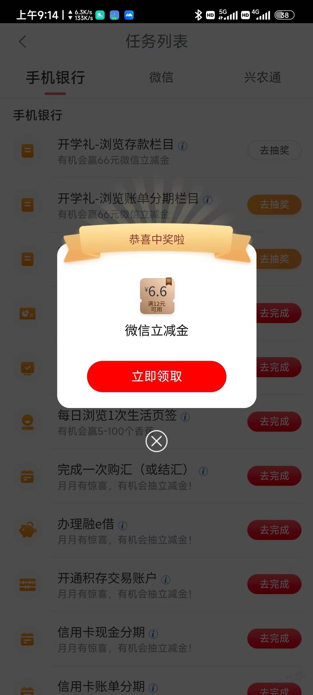 工行APP 我的 任务中心 三个开学任务 抽奖目前必中12-6.6立减金