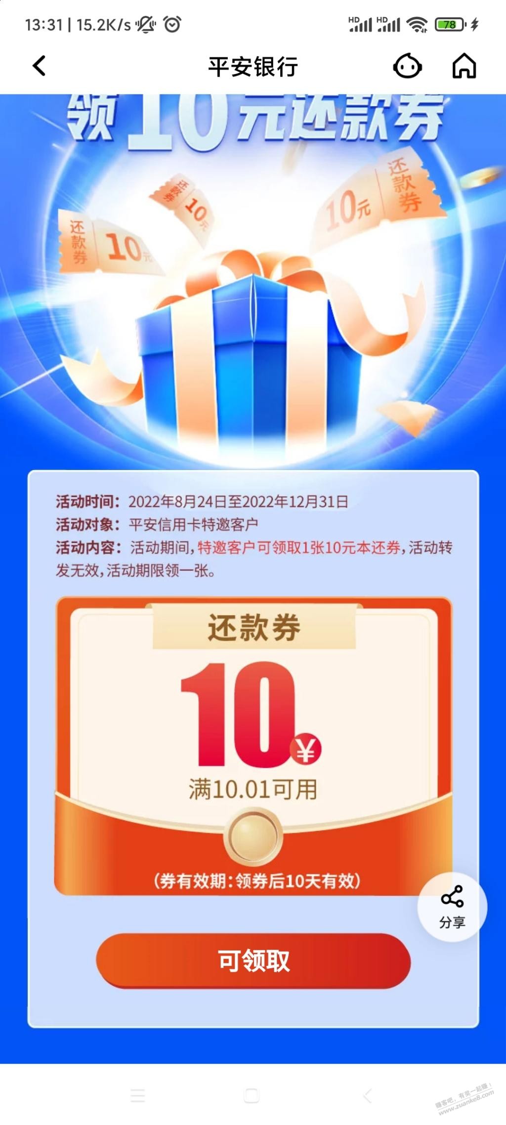 【特邀专享,10元还款券待领取】https://rmb.pingan.com.cn/t/zdxBnGJd?SSLSOURCE=BROP-CMP&activity_FlowId=m_L0OBoOWCopnrjX4Y2750 点击链接或复制这段描述¥m_L0OBoOWCopnrjX4Y2750¥后打开平安口袋银行APP