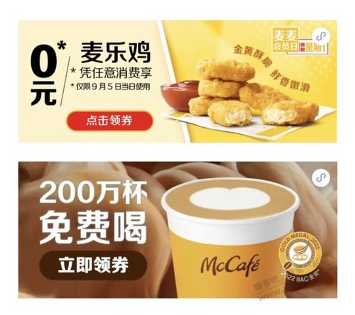 麦当劳0元麦乐鸡 麦咖啡200万杯免费喝(任意消费) 2022年 9月 1日 10:30 作者 kkkkn https://mp.weixin.qq.com/s/964KwHaj83Y8xd7dh779wQ