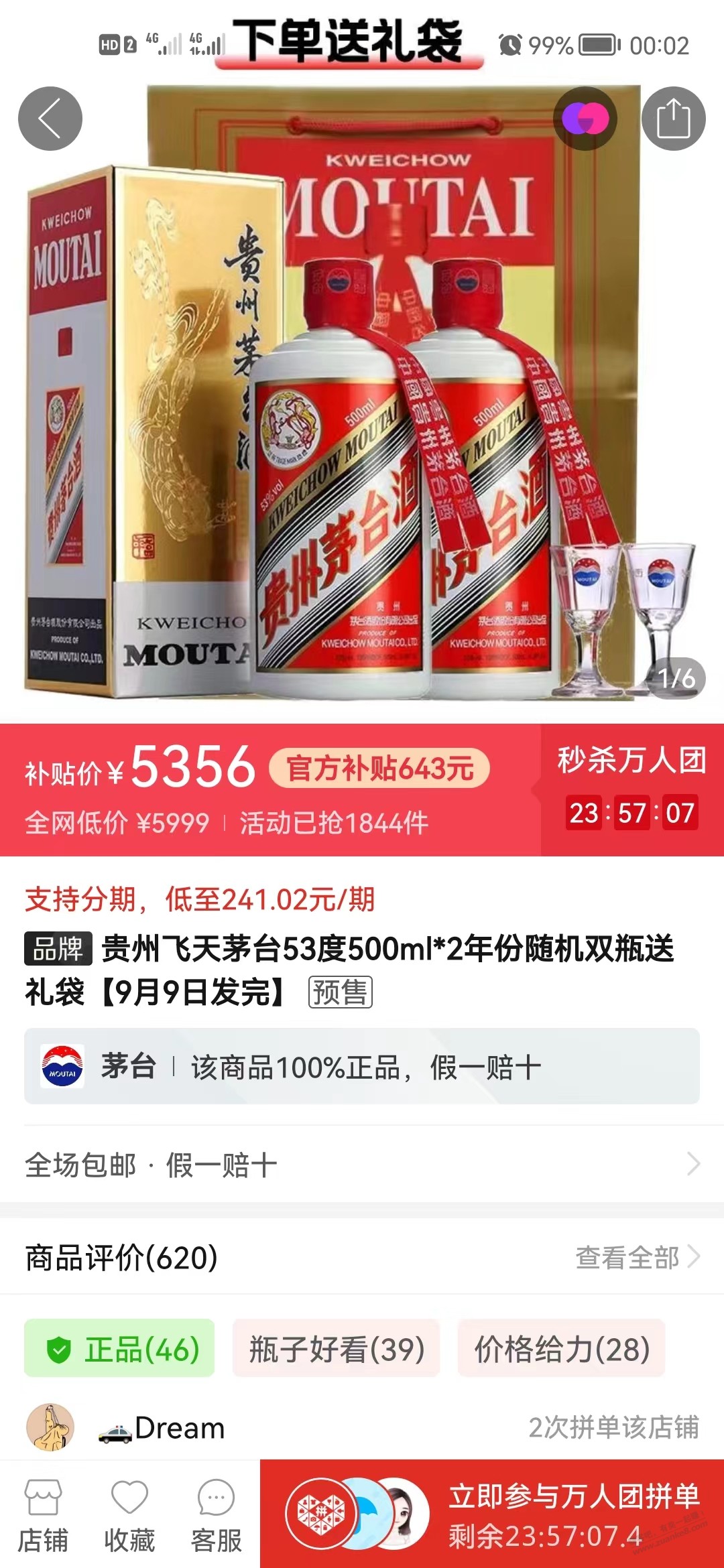 拼嘟嘟茅台万人团一单拍两件600+大毛