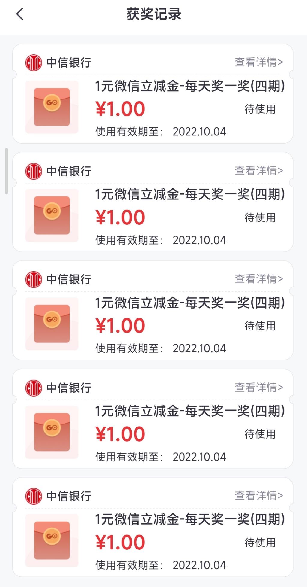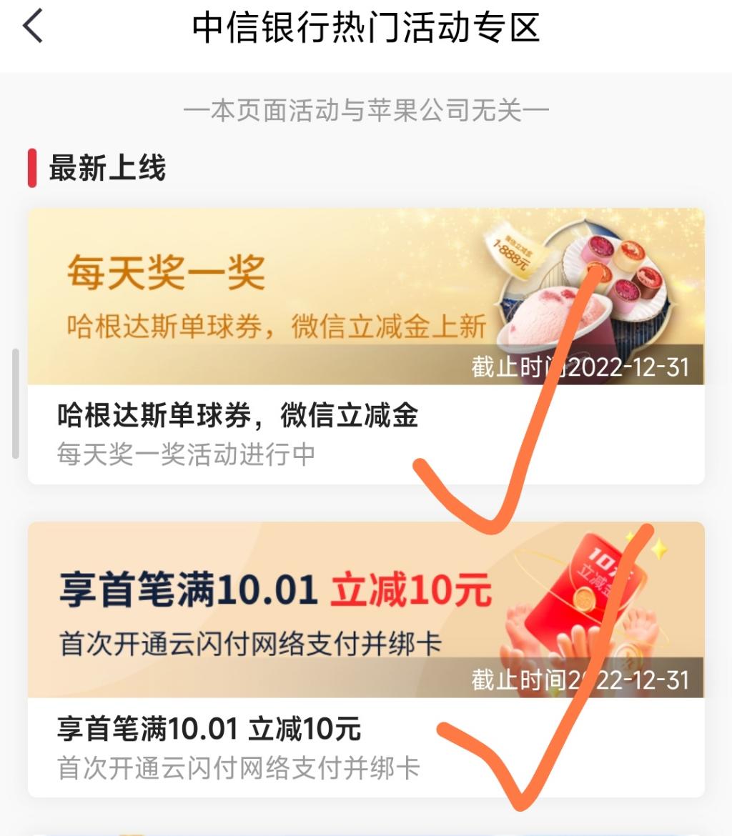 中信15元红包 2022年 9月 5日 22:00 作者 kkkkn 活动路径:中信银行APP,生活,热门活动 每天奖一奖,把能做的任务做一下,可得5元VX立减金 第2个活动,点进去开通云闪付网络支付。开通后,返回中信首页扫吧码11元,可立减10元。