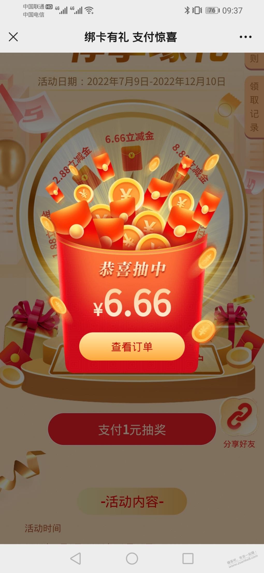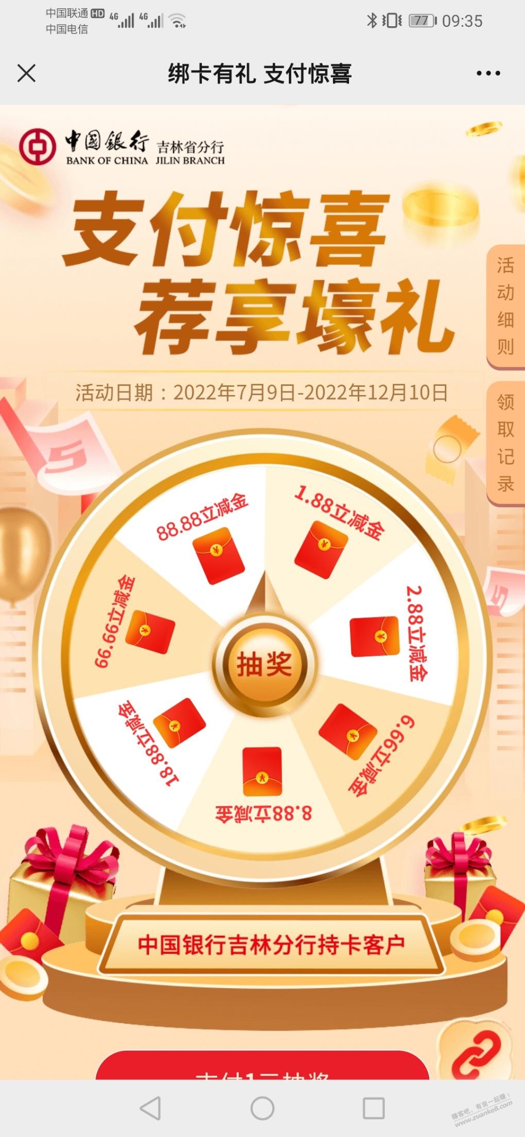 吉林省支付一元抽中行V.x立减金,需要中行储蓄卡支付