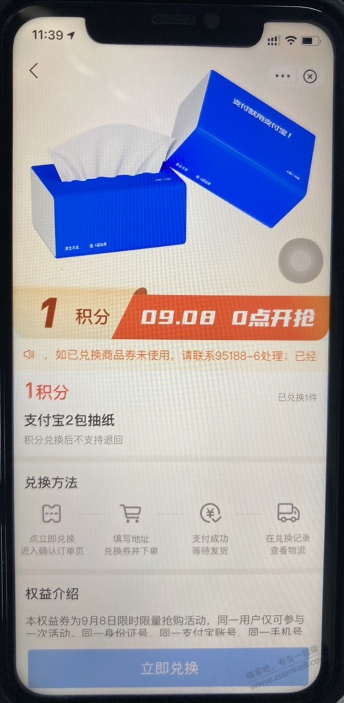 9月8号0点开始1积分兑换,纸的质量说不好但是凑合着也还行,就跟餐馆里的纸差不多的水平。刚需的可以上了