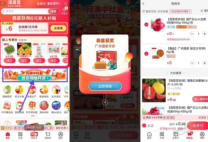 【淘菜菜抽免费月饼】 2022年 9月 7日 20:16 作者 kkkkn 【淘宝淘菜菜抽免费月饼一盒】淘宝搜索“淘菜菜”进入->月满中秋宴->进入直接抽月饼->抽中月饼随便加一个低价的商品到购物车一起结算就可以了