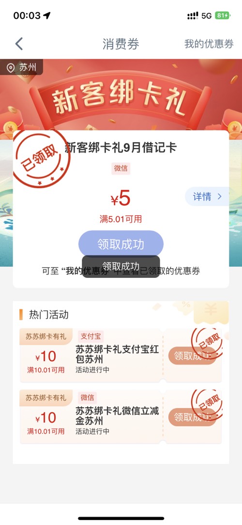 支付宝那个10元上次领完了又有了,还新增了一个5元的,不是新客也领了