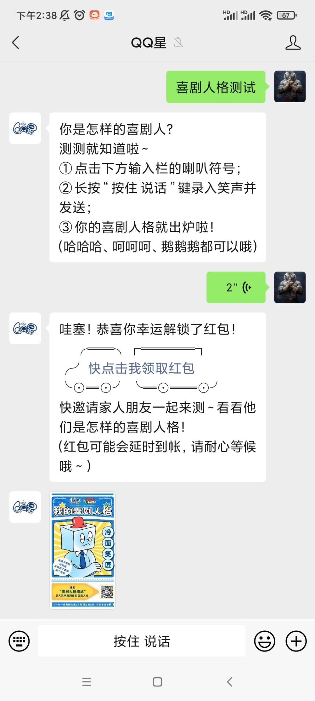 VX关注公众号qq星,然后发送喜剧人格测试,然后再随便发条语音,必中