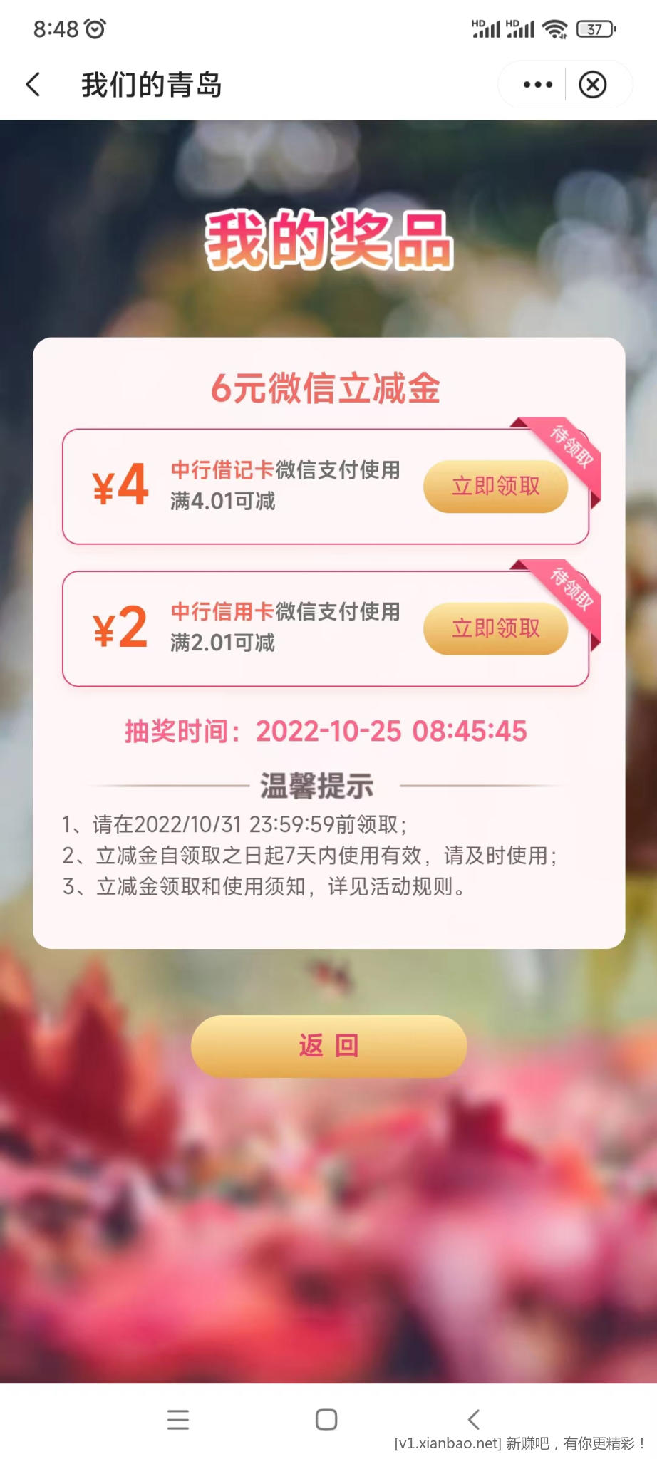 中行,V.x立减金活动,中6元(青岛,其他地区自测)